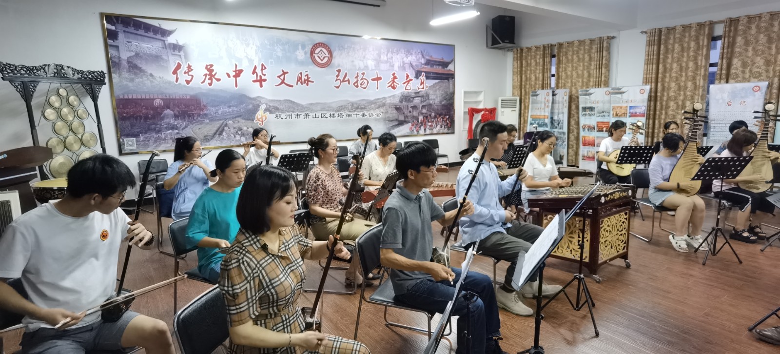 6月26日晚,在萧山区楼塔镇楼塔“细十番”协会排练厅内,我校青年教学实践志愿服务团2021年度楼塔“细十番”新传承人培训春季学期第12次课程暨学期教学成果展示如期进行。受训学员与浙艺青年师生一起完整演奏楼塔“细十番”一套三曲,校地合作致力非物质文化遗产传承保护的道路就此走过了第五个年头。