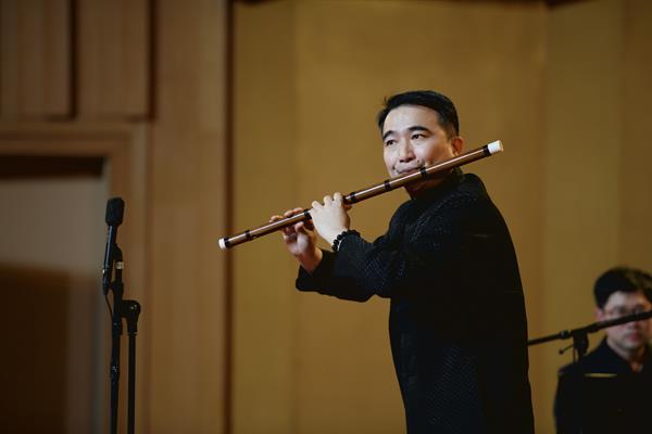 笛坛名曲《幽兰逢春》是赵松庭先生生前创作的最后一首作品,是其艺术成熟时期的代表之作。该作优扬雅致、委婉抒情,赞美了兰花的清雅幽鑫,展现了人在困境中悲而不伤的心境。音乐会上,由赵松庭笛子艺术研究会副会长、中国音乐家协会竹笛专业委员会理事、浙江歌舞剧院民族乐团青年笛子演奏家朱炜再度演绎了这首经典佳作,赢得了观众热烈掌声。朱炜是浙艺2000级校友,毕业后的他事业有成,大量的舞台经验成就了他独特的演奏风格,成为民族音乐艺术道路上的成功践行者。