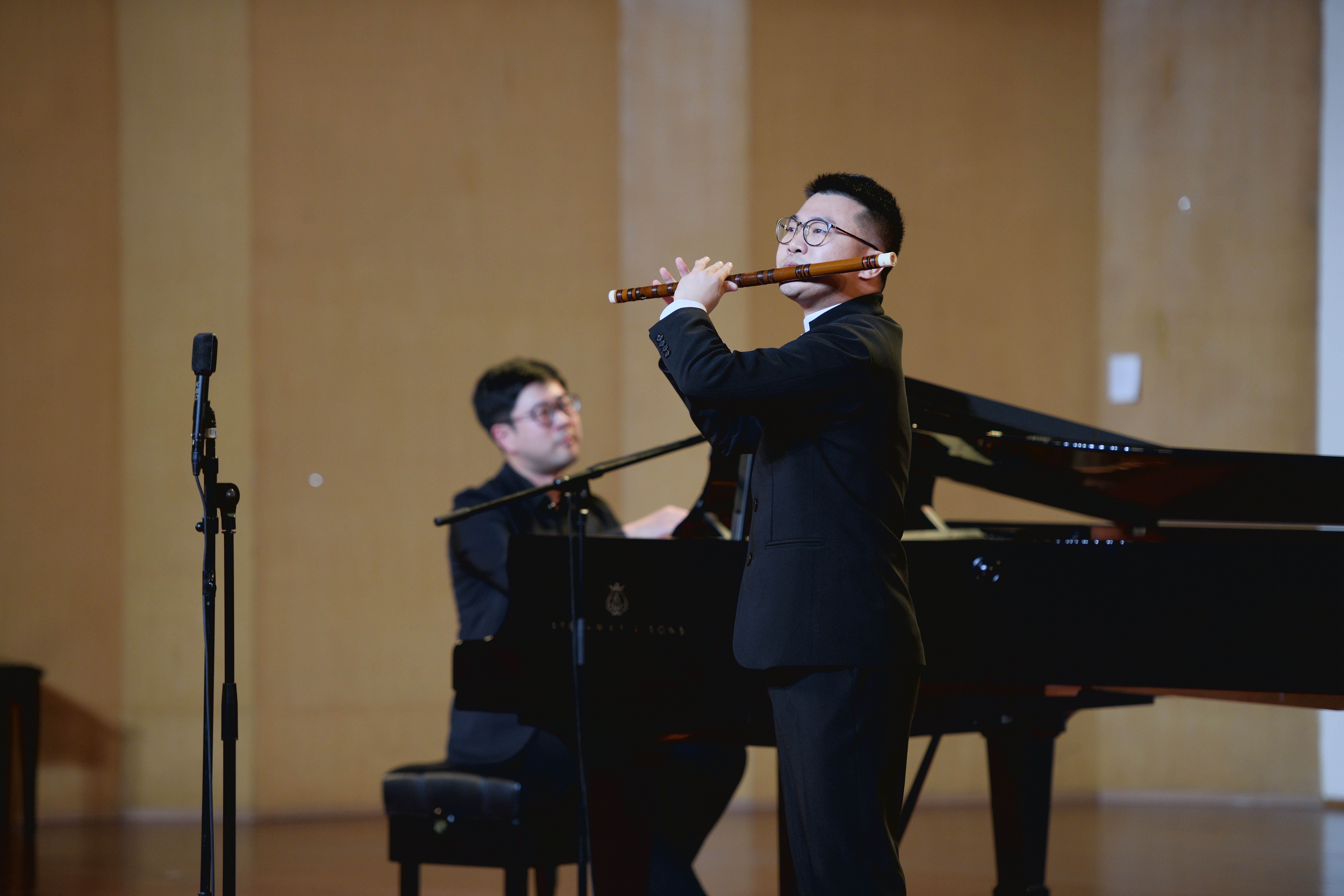 我校音乐系竹笛专业教师常轶伟带来了一首充满西域风情的《胡旋舞》。该曲由台湾作曲家钟耀光作曲,原是一首西洋长笛曲2010年经中央音乐学院博士生导师戴亚教授改编后作为当年台北笛子大赛决赛规定曲目,是目前笛曲中技术难度较大的作品。作为浙艺音乐系民乐教研室青年教师代表的常轶伟,自2020年荣获“新松计划”浙江省青年演奏员大赛吹奏组一等奖后,此番再度亮相舞台,带来了精彩纷呈的出色演绎。