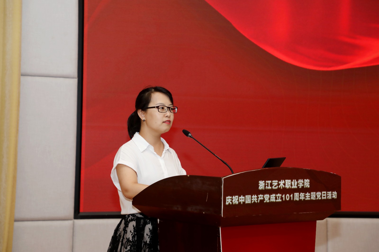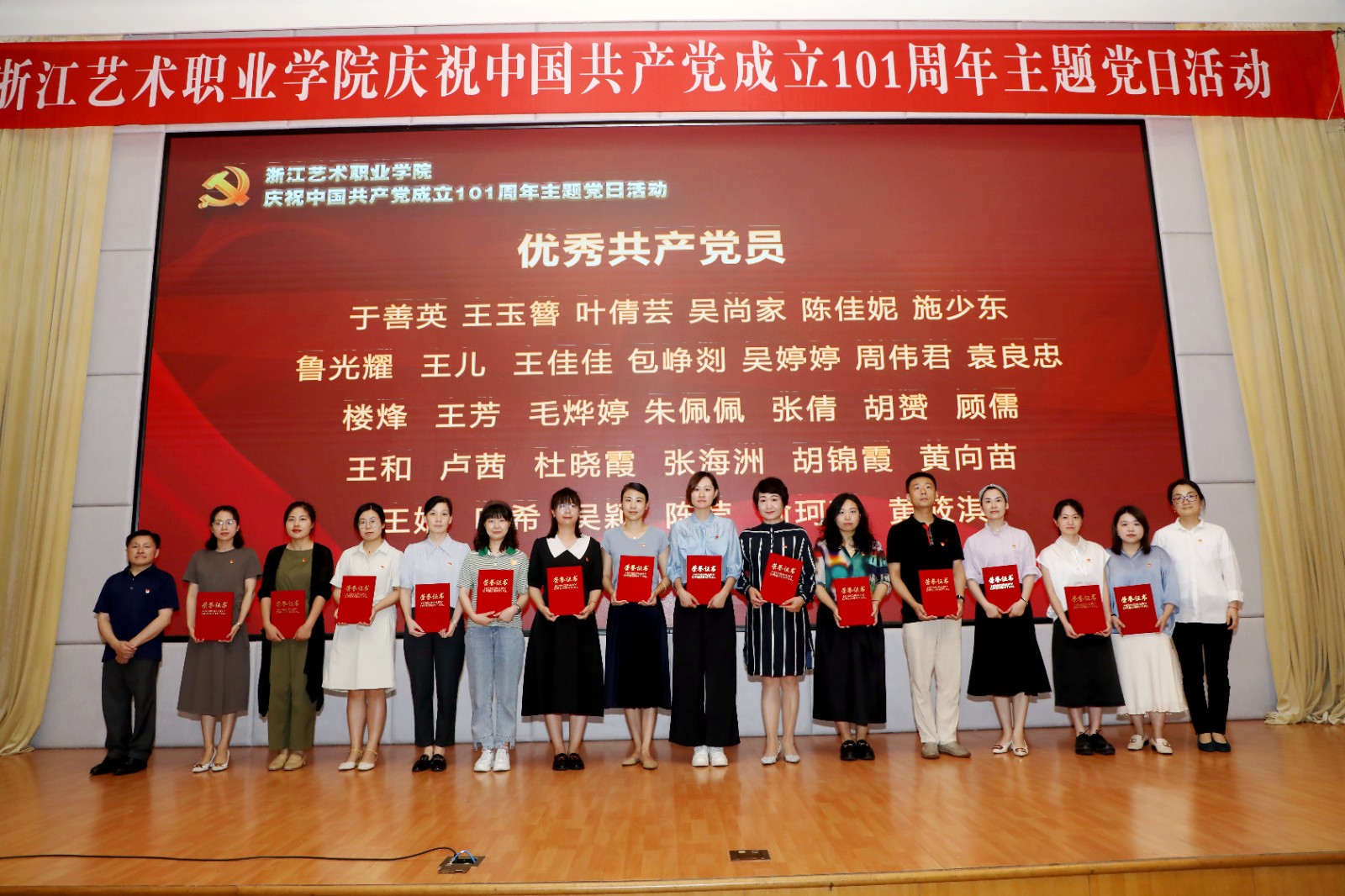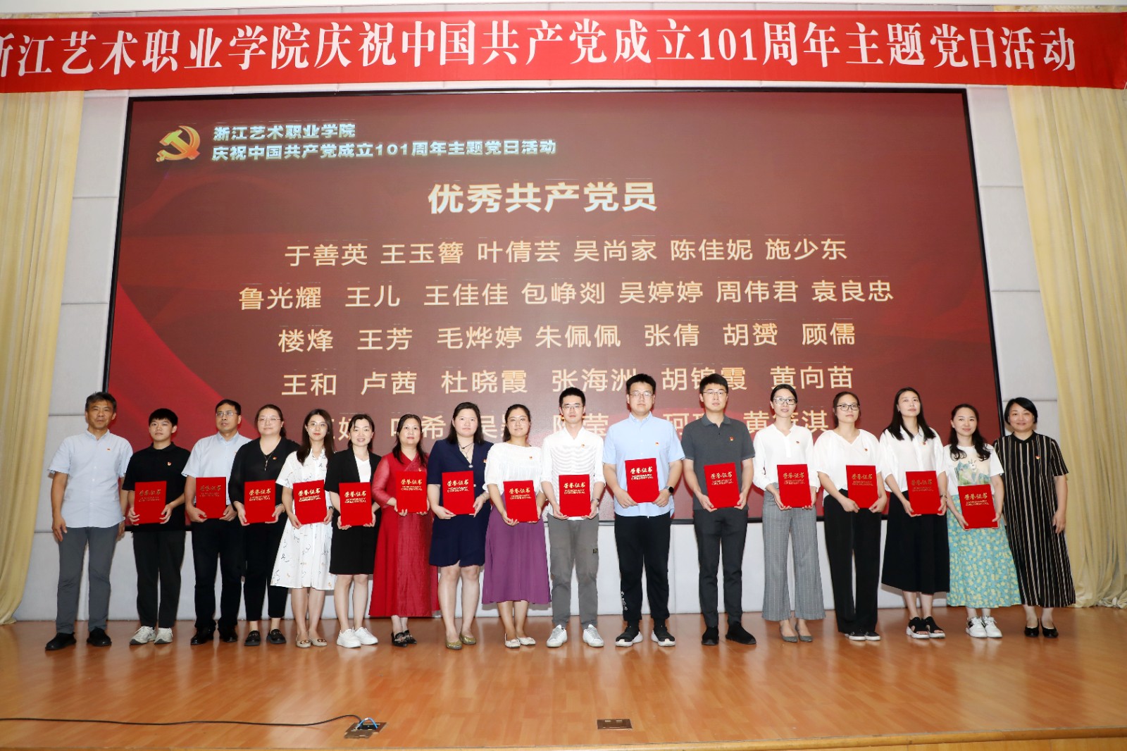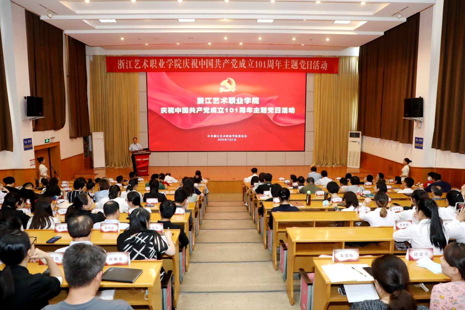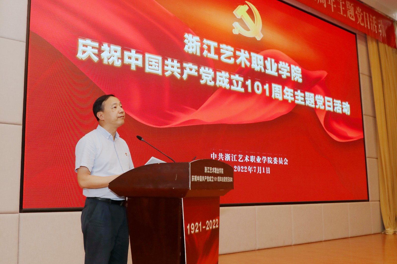 为庆祝中国共产党成立101周年,回顾党的光辉历程,讴歌党的丰功伟绩,赓续红色血脉,浙江艺术职业学院在学校图信报告厅隆重举行庆祝中国共产党成立101周年主题党日活动。校党委班子成员,各党总支、直属党支部书记、副书记,全体中层干部、主管岗位人员,基层党支部书记、组织员和师生党员代表、学校“两优一先”受表彰对象、2022年发展的新党员代表参加活动。校党委书记薛亮作省十五次党代会精神宣讲,院长、党委副书记黄杭娟宣读表彰名单,校党委副书记夏开堂主持活动。