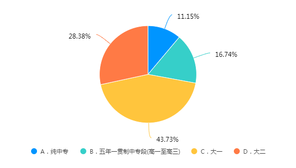 本次调查共收回问卷2879份(含纯中专321份,五年一贯制中专段482份),占全校学生总数(不包括2022届毕业生)87.35%。各年级段以及各专业学生参与情况如下图: