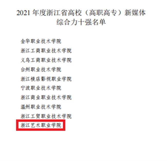 近日,浙江省教育厅新闻办公室、浙江教育报刊总社公布了2021年度浙江省优秀教育新媒体评选活动结果,浙江艺术职业学院荣获浙江省高校(高职高专)新媒体综合力十强。