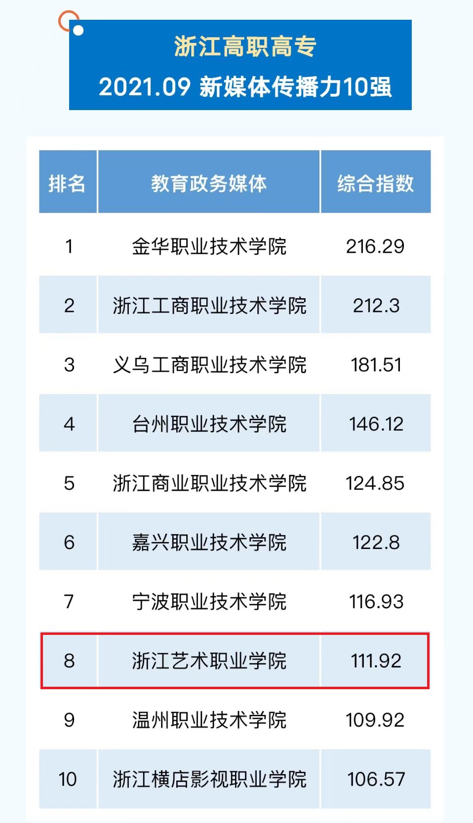 在2021年浙江教育政务新媒体传播力月排行榜中,浙艺多次进入全省高职院校前十强。