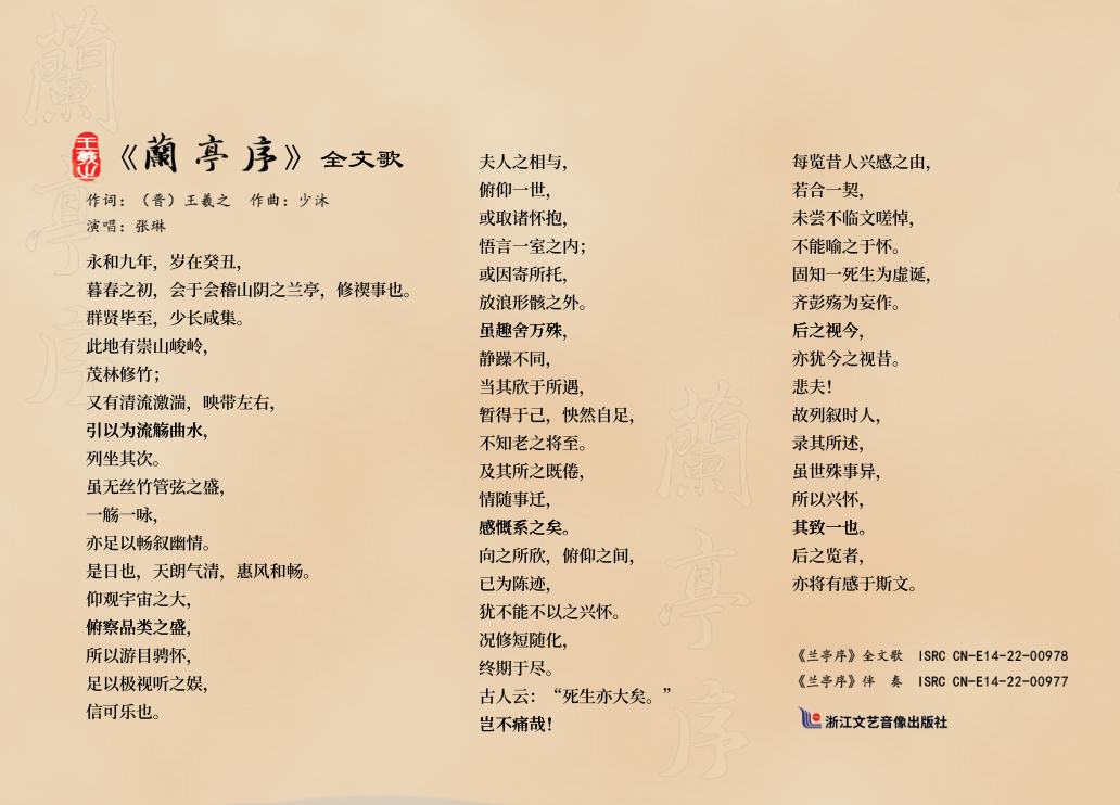 一春芳意,三月和风,东晋“书圣”王羲之等一众文人墨客若在天有灵听《兰亭序全文歌》,将喜出望外,含笑九幽。