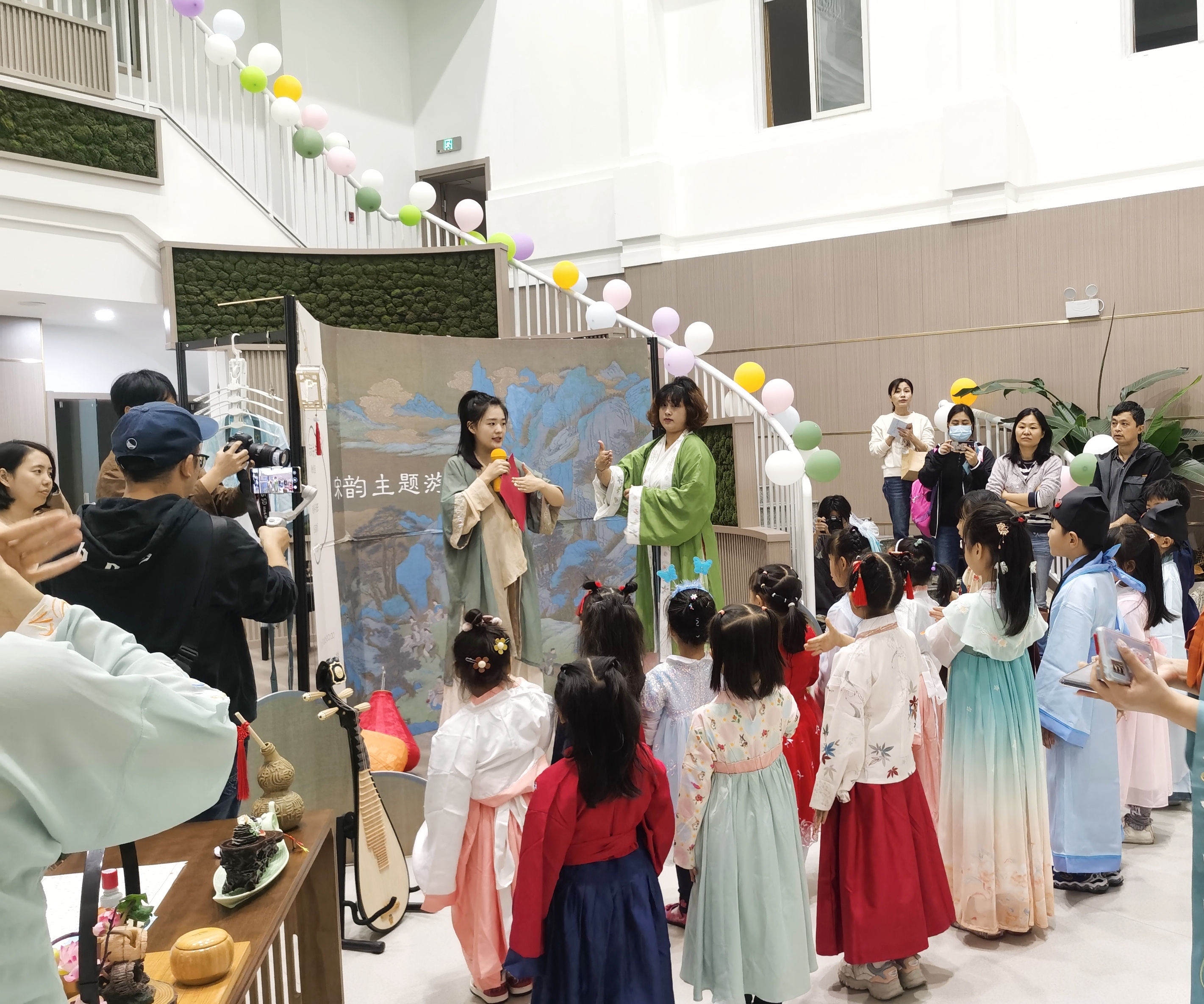 走进浙艺学的宋韵亲子游园会的现场,大厅中庭布置了经典宋画《千里江山图》《女孝经图》,书法纱幔、植物标本灯笼,古韵音乐伴随着游园活动流淌开来。“开笔礼”、点红仪式、“作揖礼”带领小朋友们开启宋韵世界。家长们表示,这场活动主题好、寓意深,让少年儿童从内心深处认同和喜爱我们的传统文化。