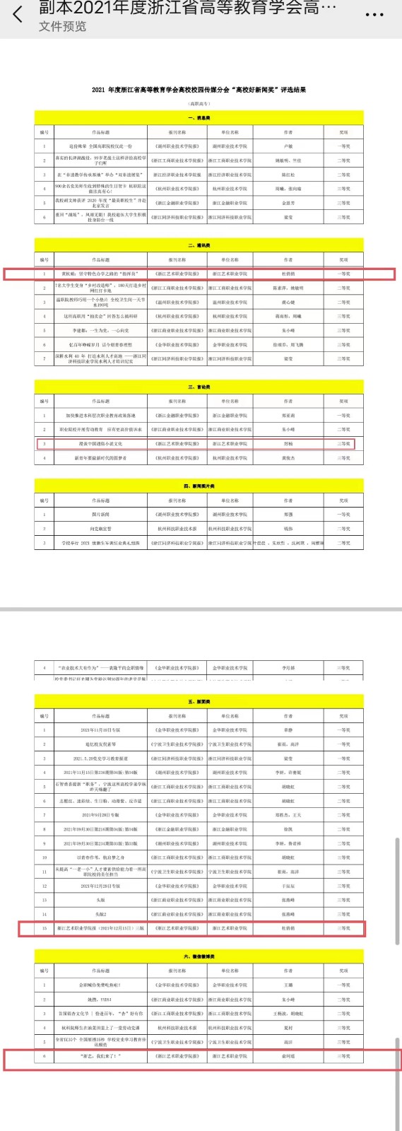 近日,2021年度浙江省高校好新闻作品评选结果出炉,我校获多个奖项。《黄杭娟:坚守特色办学之路的“指挥员”》(作者:杜俏俏)获通讯类一等奖,《漫谈中国通俗小说文化》(作者:厉楠)获言论类三等奖,《浙江艺术职业学院报》2021年12月15日三版(编辑:杜俏俏)获版面类三等奖,《“浙艺,我们来了!”》(作者:俞珂瑶)获微信微博类三等奖。