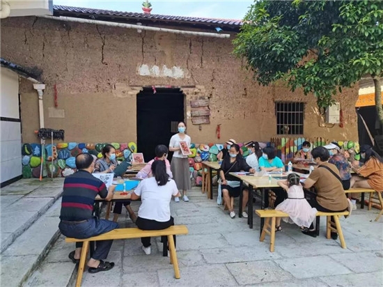 ▲浙艺师生走进东信社区,带领居民体验端午香包、创意扎染、创意扇面、剪纸等非遗技艺
