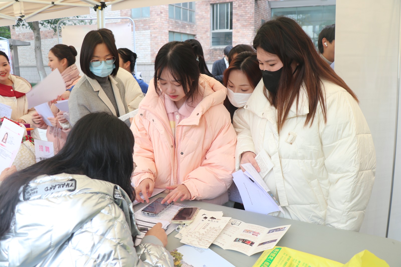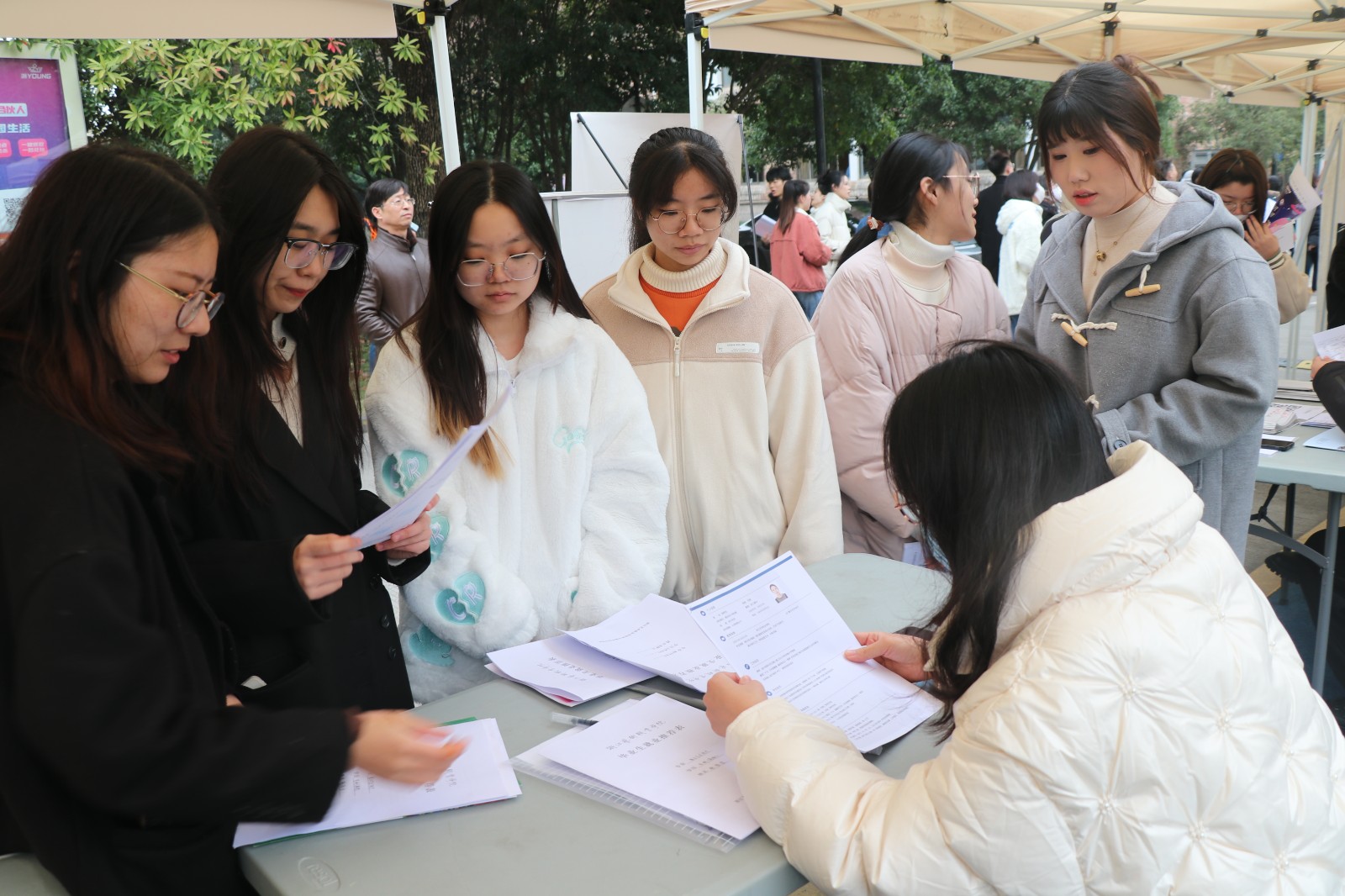 招聘会现场,2023届毕业生们着装整洁,手持简历,认真浏览招聘企业信息,寻找自己感兴趣的岗位,积极主动地与企业招聘人员沟通、交流,介绍自己的专业优势和岗位期待。