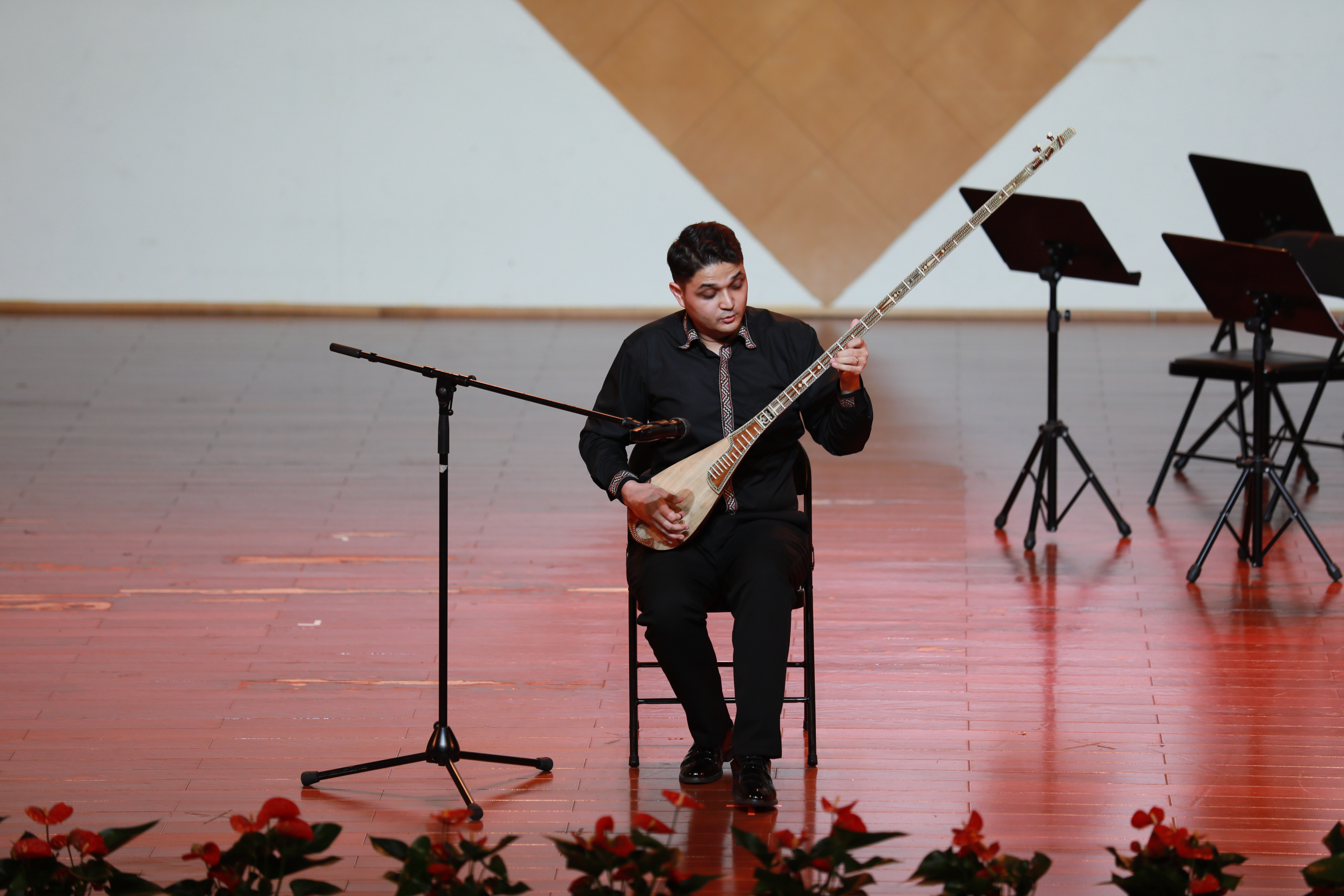 音乐会共9个节目,其中西尔扎提江在我校青年实验民族乐团的同学伴奏中,用新疆特有的弹拨乐器弹布尔演奏了原创作品《伟大祖国》表达了强烈的爱国情感,增强了听众的民族自豪感、自信心。第二首传统弹布尔独奏曲《晨曲》,优美的旋律仿佛将人带到了新疆辽阔草原和广袤大漠的晨景中,绚丽多彩。现场西尔扎提江还表演了富有新疆特色的木卡姆弹唱。