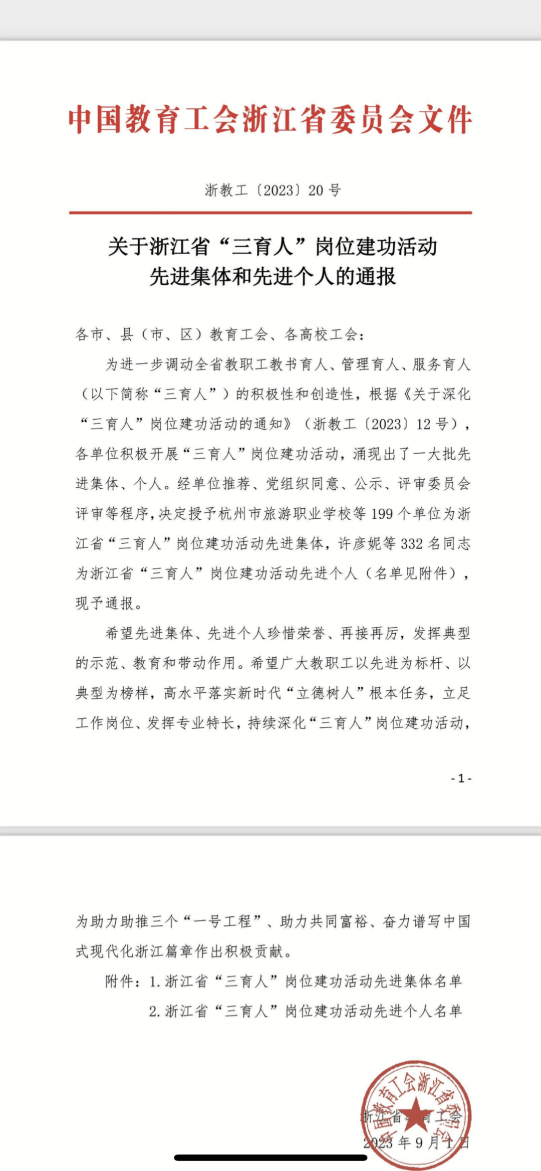 春风化雨,以德树人。在第39个教师节即将来临之际,浙江省教育工会发文表彰全省“教书育人、管理育人、服务育人”岗位建功活动中涌现出来的先进集体和个人,我校舞蹈学院获评浙江省“三育人”岗位建功活动先进集体。