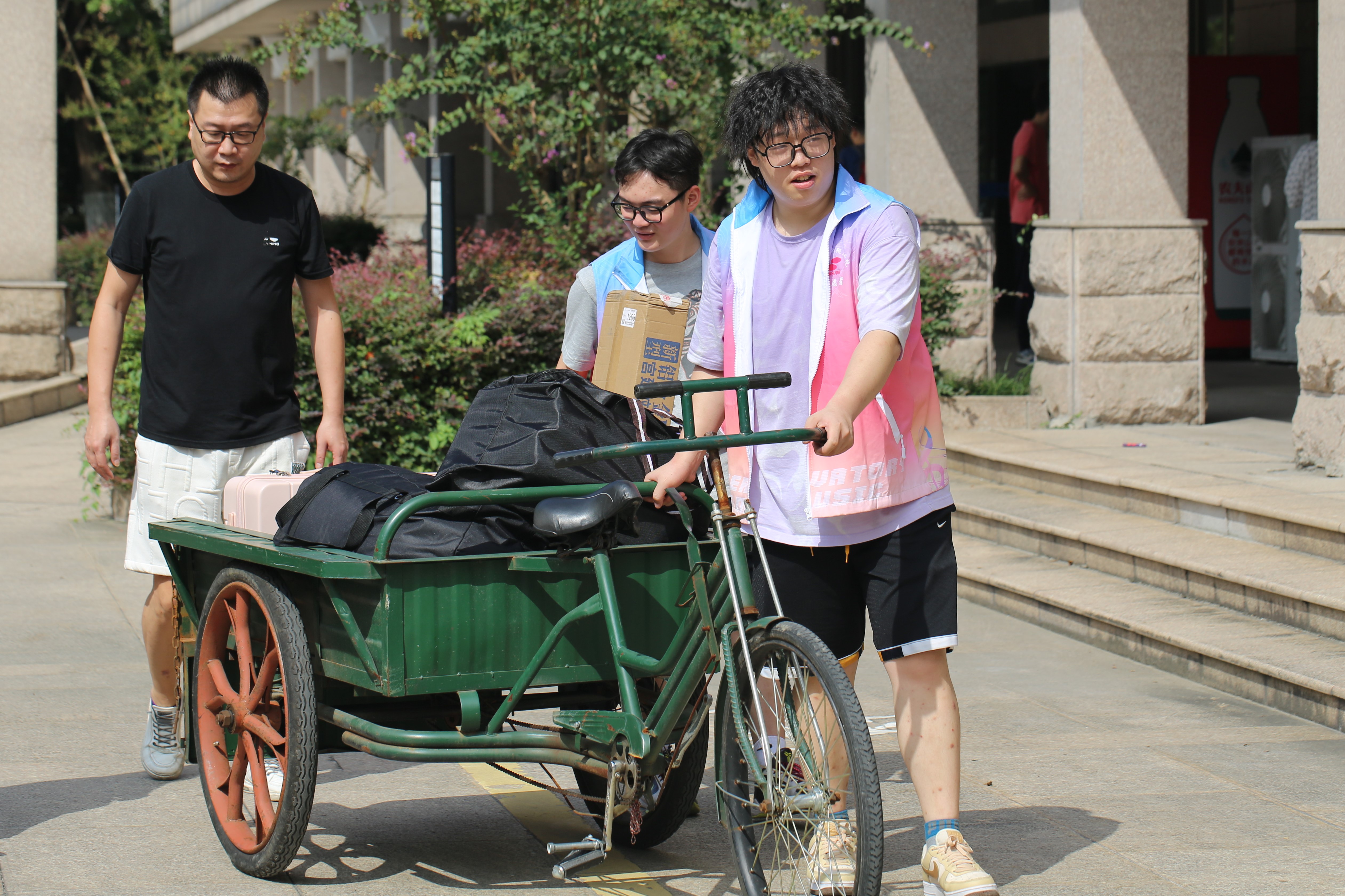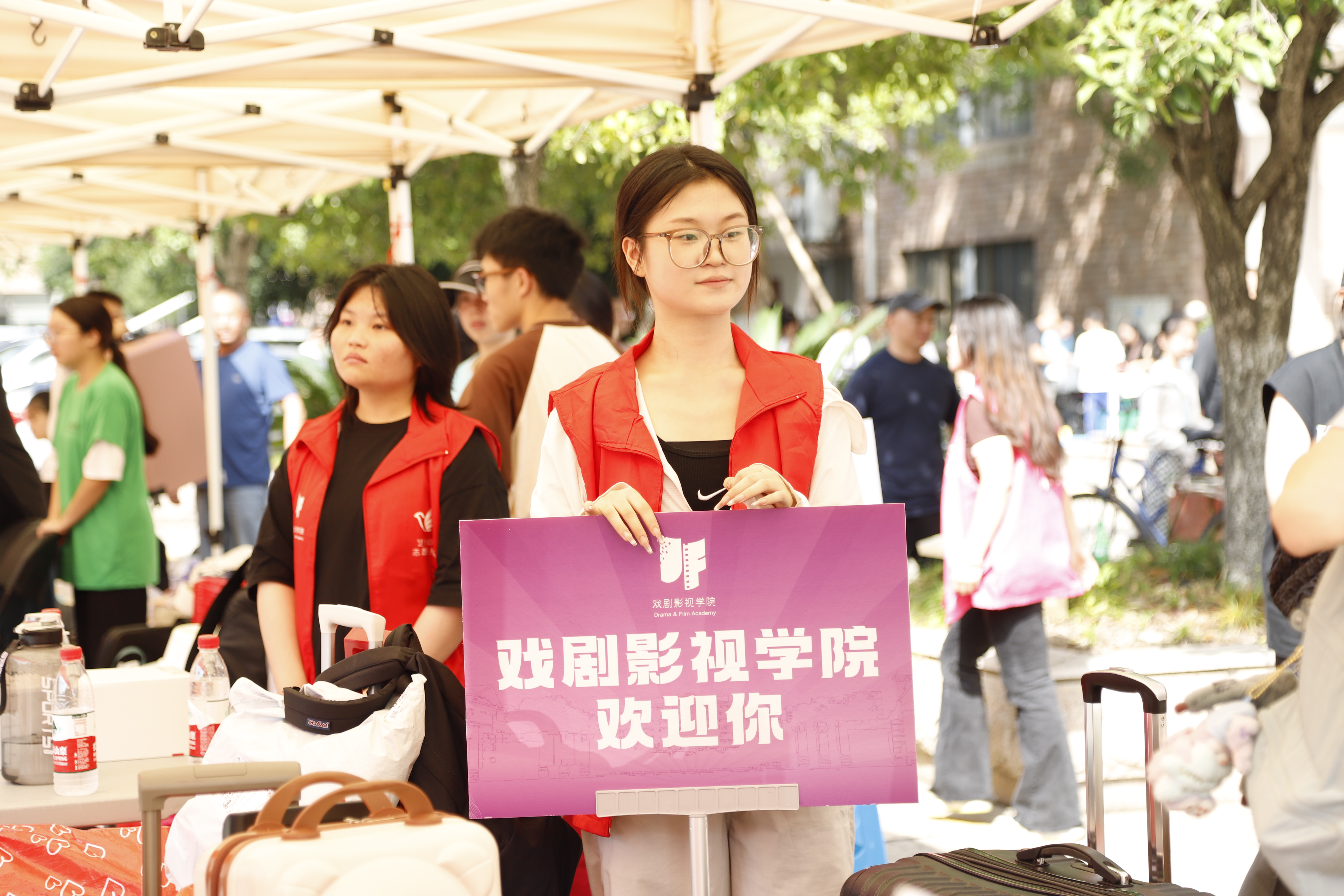 身穿红马甲的志愿者们精神饱满,在校园内引导车辆、看管和搬运行李等,为新生报到提供便利。他们来来往往的身影成为了报到现场一道靓丽的风景线。