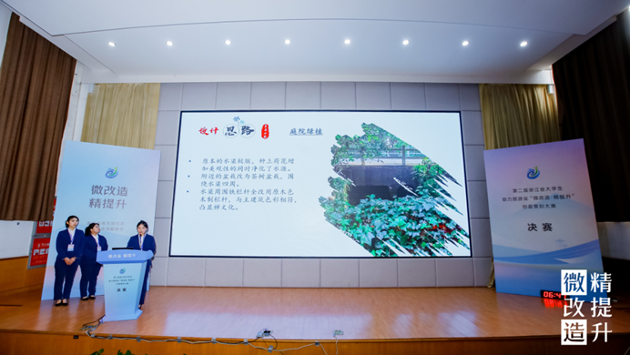 决赛现场,12组入围作品的选手代表依次上台,结合PPT和视频讲解,紧扣项目需求和设计的现实意义,对设计的整体方案、创意思路、专业知识运用等多方面进行陈述和答辩,聚焦“微改造 精提升”成果,展开激烈对决。