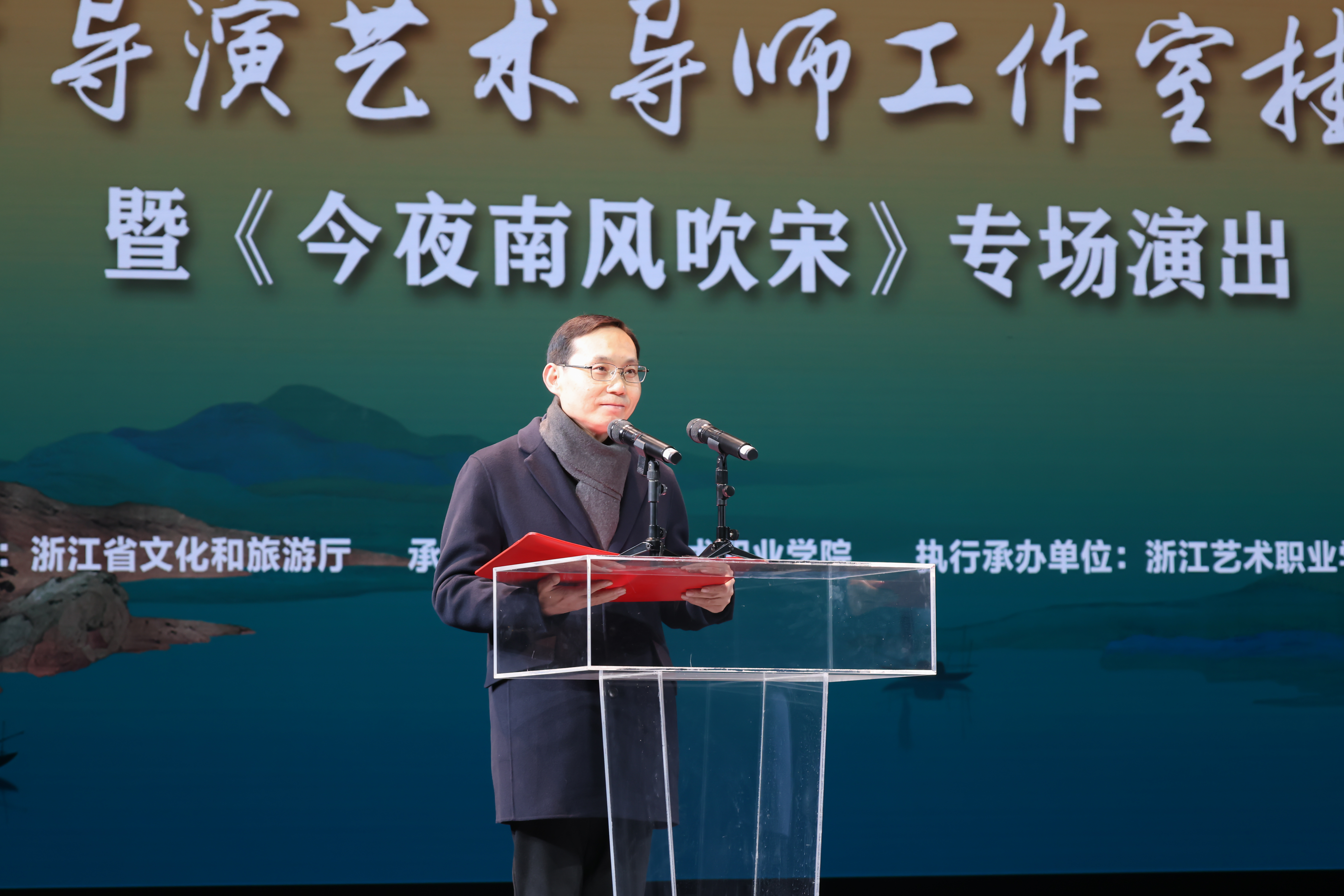 12月18日晚,浙江省杨小青导演艺术导师工作室挂牌仪式暨《今夜南风吹宋》专场演出在浙江实验艺术剧场举行。浙江省文联书记处书记赵晓刚,浙江省委宣传部原副部长吴天行,浙江艺术职业学院党委书记薛亮、院长施俊天、原院长黄杭娟,浙江省文化和旅游厅人事处处长胡雁,浙江小百花越剧院院长王滨梅,浙江艺术职业学院党委副书记夏开堂,副院长沈军甫、支涛,党委委员、宣传部部长、统战部部长马向东,党委委员、组织部部长、人才办主任刘杨,浙江省戏剧家协会副主席、秘书长谢丽泓,浙江省评论家协会副主席、秘书长沈勇以及各大戏曲院团负责人、行业专家出席。活动由施俊天主持。