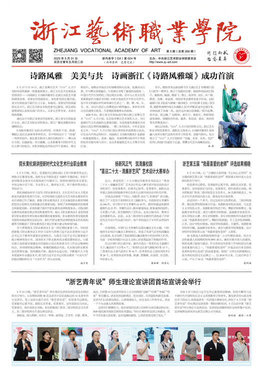 《浙江艺术职业学院报》2022 年 05 月 31 日第 5 期第 01 版(编辑:杜俏俏)获版面类二等奖