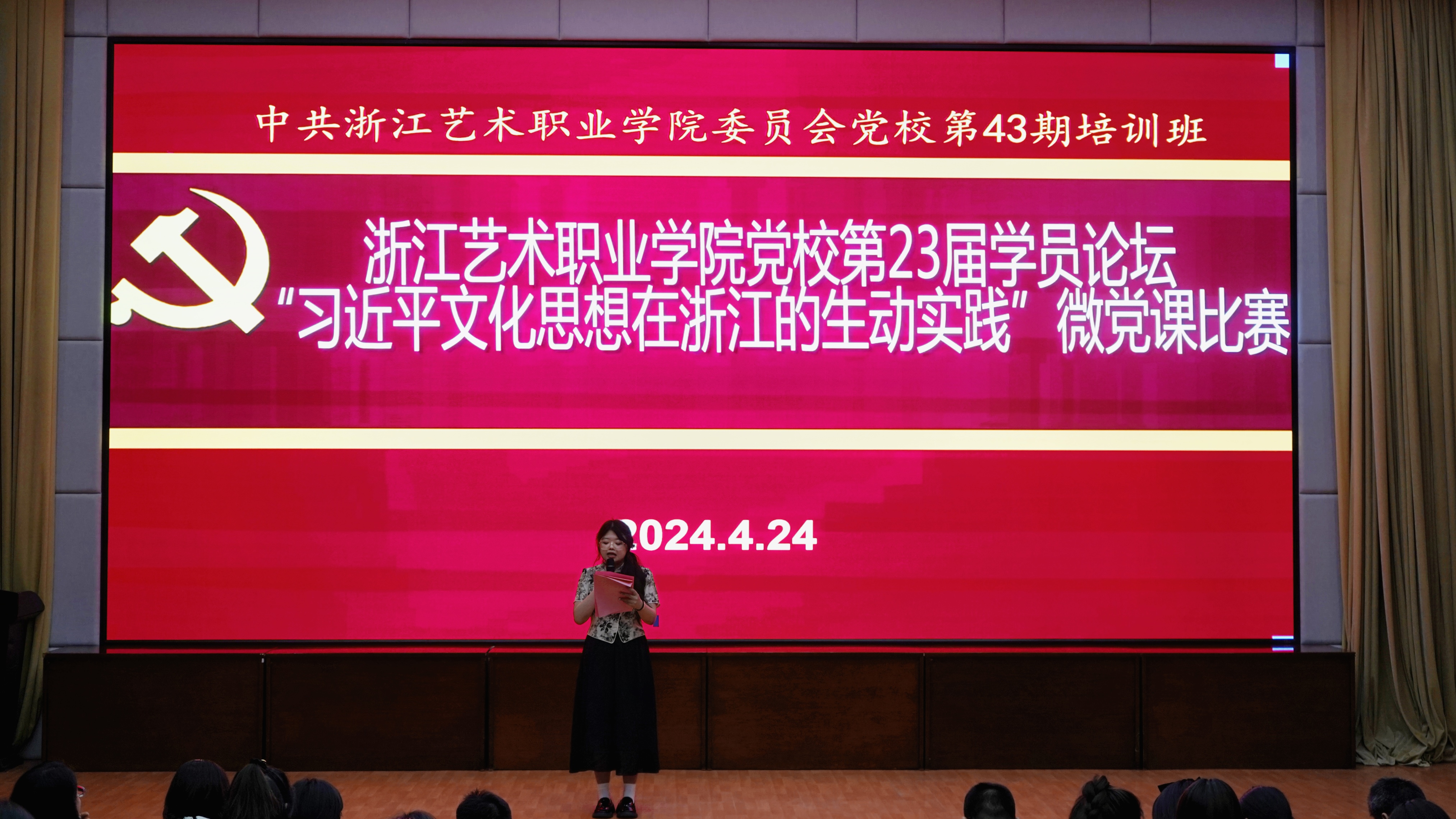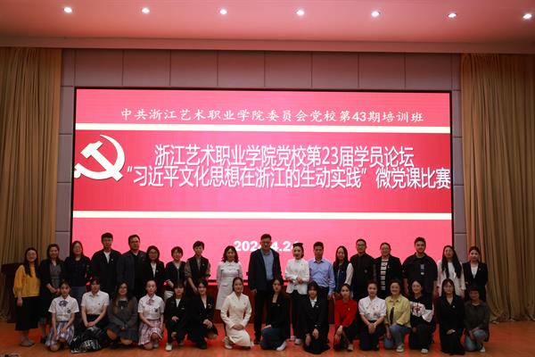 为深入学习贯彻习近平文化思想,学懂弄通做实习近平总书记对浙江工作以及文化广电和旅游系统特别是文旅融合深度发展的重要指示批示精神,4月24日晚,浙江艺术职业学院43期党校第23届学员论坛暨“习近平文化思想在浙江的生动实践”主题微党课比赛在图信中心报告厅举行。党委委员、组织部部长、人才办主任、党校副校长周应中出席,组织部、宣传部、各教学单位党总支(直属党支部)负责人、党校任课教师、党校班主任、第43期党校学员共170余人参加并观摩比赛。