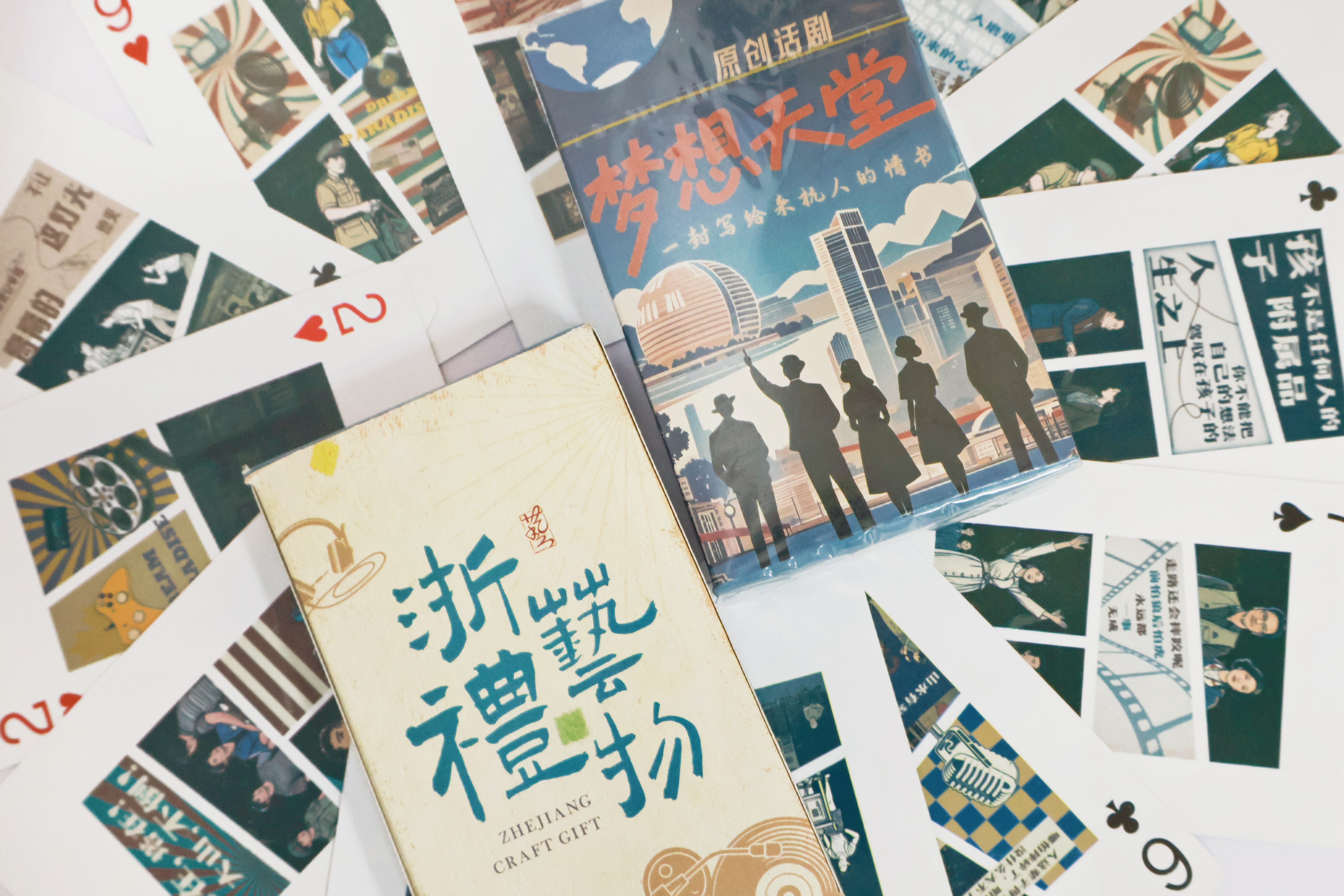 扑克牌整体通过“场景符号+情感叙事”使传统纸牌与话剧内容深度融合。包装正面将《梦想天堂》海报风格化转换,以蓝色为主色调,笔触勾勒环境与人物,更具设计感。包装背面以“浙艺礼物”LOGO为视觉中心体现学院共创,风格与牌面呼应,复古底纹与物件相互配合。牌面按照花色共设计13张基础花色与2张大小王花色,每张牌面整体对剧中元素细腻还原的同时,采用复古插画的创新形式选取剧中经典场景与台词,融入90年代电视、收音机等复古元素,通过鲜活的角色形象,展现出话剧的温情。打造集娱乐、社交与文化体验于一体的怀旧纸牌,让玩家在游戏中重温剧情温度。