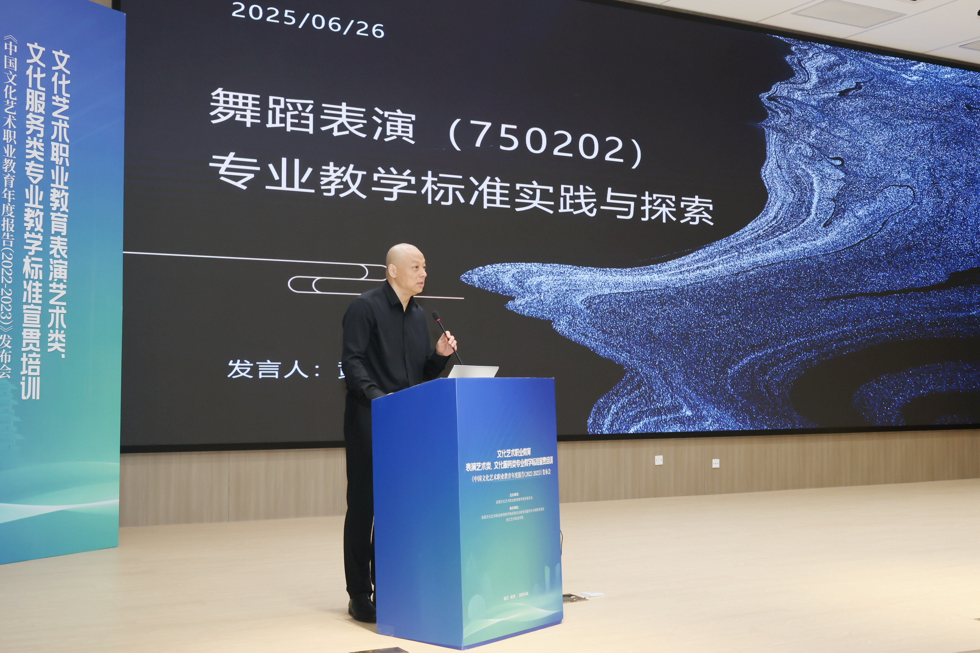 文化和旅游部科技教育司副司长刘冬妍,浙江省文化广电和旅游厅二级巡视员程钢,教育部标准研制综合组组长、教育部教育评估中心原副主任李志宏,文化艺术行指委副主任委员、文化艺术类标准研制工作组副组长黄杭娟,浙江艺术职业学院党委书记薛亮、校长施俊天等出席,近200位文化艺术行指委委员和艺术职业院校负责人、专业带头人、骨干教师等齐聚一堂,共同解读和探讨新版文化艺术类专业教学标准。