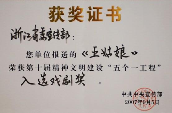 音乐剧《五姑娘》荣获”五个一工程”奖