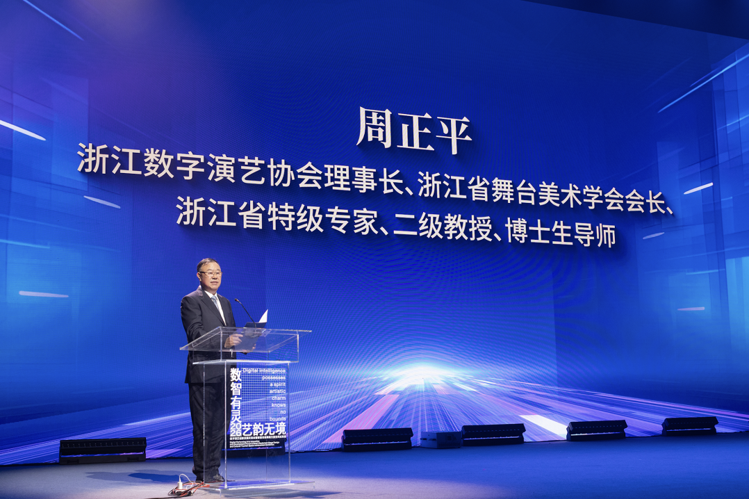 作为本次活动的总牵头人,我校设计学院首席专家(二级教授)、浙江省数字演艺协会理事长、浙江省舞台美术学会会长周正平深情回溯了协会成立的初心,系统阐释了本次活动的策展逻辑,并分享了浙江在数字演艺领域的先行探索,以务实创新的姿态为盛会奠定思想基调。