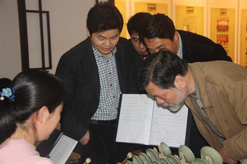 在张建国院长的带领下,浙艺院一行八人来到慈溪,考察省级非遗项目“越窑青瓷瓯乐”。在青瓷瓯乐艺术团,我们见到了谢杰锋团长、陈珊岳董事长、丁钊年副团长和他们手下的一群年轻团员,大家碰在一起,非常高兴。谢团长首先给我们介绍了青瓷瓯乐,带领我们参观他们精心布置的陈列室,陈列室里有照片,也有他们研制的各种青瓷乐器。然后,招呼我们坐下,端来四明山茶,一曲曲优美、清脆悦耳的瓯乐响起来了。第一曲是瓯乐合奏《春晓》(顾冠仁作曲),第二曲是奚琴重奏《窑工乐》(杨浩平作曲),我们听着一曲曲以瓷瓯、瓷盘、瓷片琴等为主奏的瓯乐,美极了!