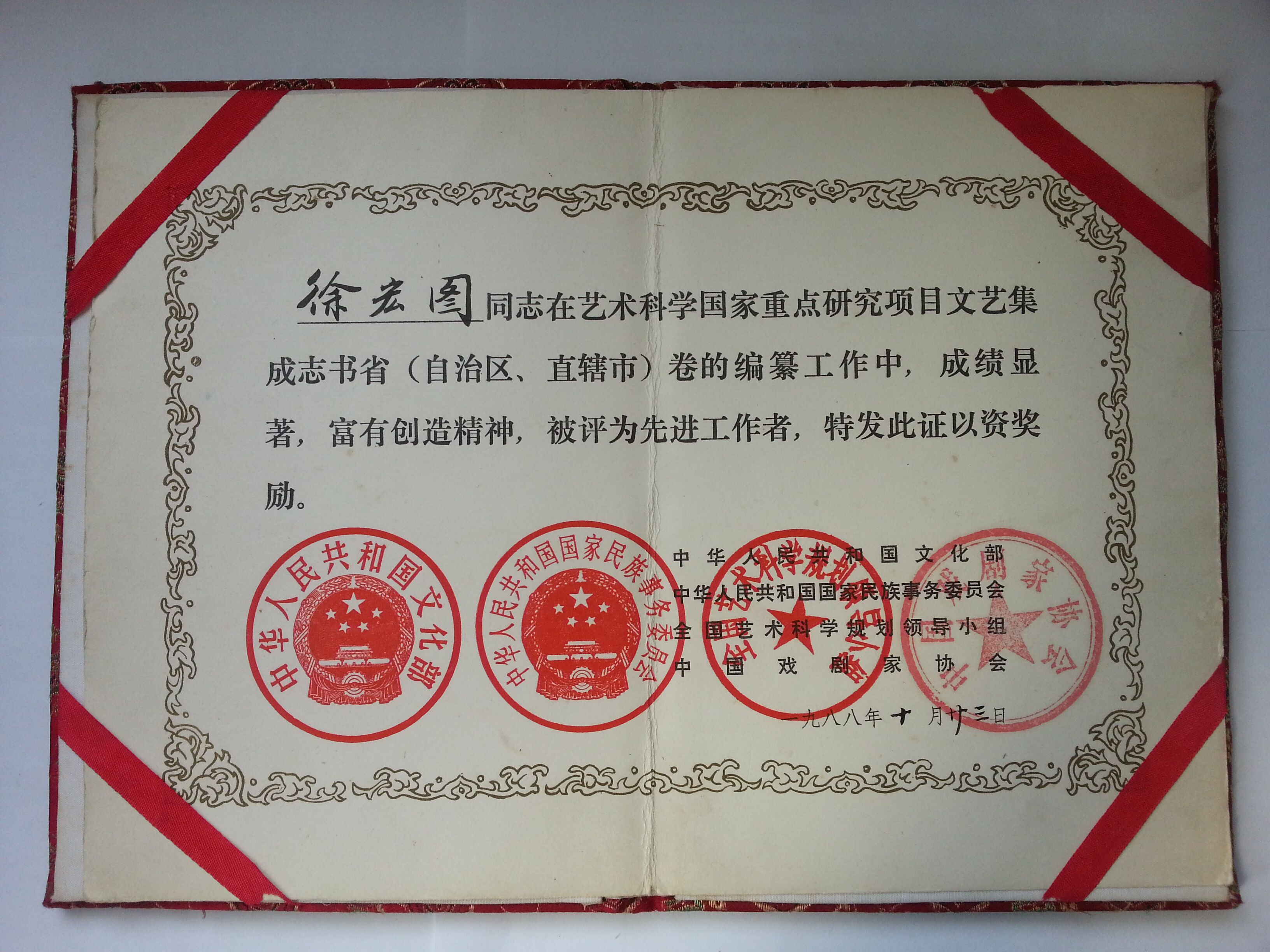 编纂戏曲志,是文化部于1983年下达给各省的紧迫任务,是跨国家“六五”、“七五”计划的“十大文艺集成志书”工程之一。戏曲历来无志,这次是破天荒,对我来说是难逢的好机会,成为我学术生涯的转折点。我有了下剧团体验生活的经历,到瓯剧及高腔院团体验生活。虽然时间不长,却让我过了一把彩排、开台、过台基、讨彩、扫台等演艺生涯之瘾,终身受益与难忘。编纂期间参加了全省戏曲大普查。这是新中国第一次,搜集散落各地的戏曲资料,包括手抄本、曲谱、剧照、面具、脸谱、服装、道具等。调查对象达2000余人,收集原始资料5000余万字,图片上万张,还有大量的音响资料,仿佛进入金山银山,珠光翠影,应接不睱,为日后的戏曲研究积累了大量史料。