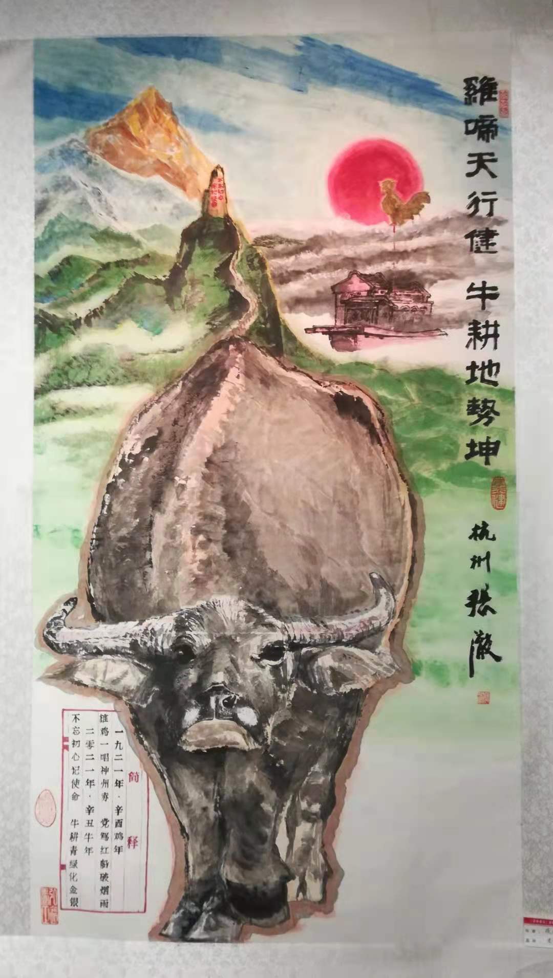 (中国画,六尺整张。1921年,农历辛酉鸡年,毛泽东主席曾以“雄鸡一唱天下白”诗句歌赞中国共产党的成立给中国人民带来光明和希望。2021年,系农历辛丑年牛年,习近平总书记号召全党“不忘初心、牢记使命”,继续发扬光大孺子牛、拓荒牛、老黄牛“三牛”精神。)