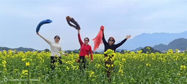 午后时分,阳光倾洒而下,暖而不燥,微风轻柔拂动,恰似大自然最温柔的轻抚。老同志们满怀期待地踏入下江村油菜花田,刹那间,一片浩瀚无垠的金色海洋扑面而来,与澄澈湛蓝的天空、洁白如雪的云朵相互映衬,勾勒出一幅如梦如幻、美不胜收的春日巨制。老姐妹们手挽手、肩并肩,三两成群地漫步于花海之间,她们或是轻嗅那馥郁芬芳的花香,或是精心挑选角度,用相机定格下这美好的瞬间,欢笑声此起彼伏,在花海中久久回荡,尽情沉醉于这春日限定的浪漫时光,让身心与大自然完美交融。